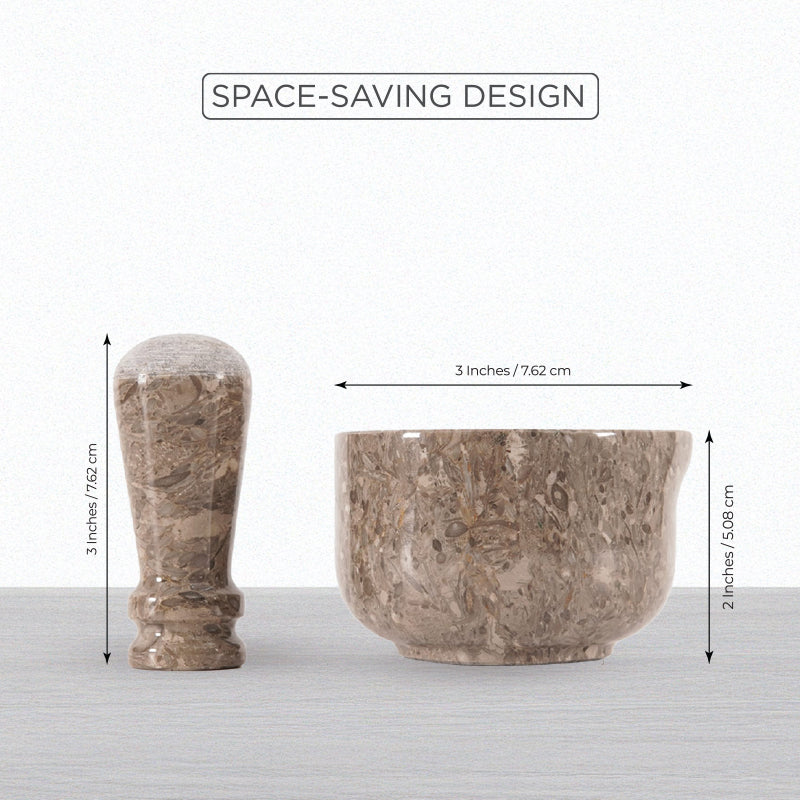 SIZE - MORTAR: 2'' Height x 3'' Diameter. PESTLE: 3'' Height.